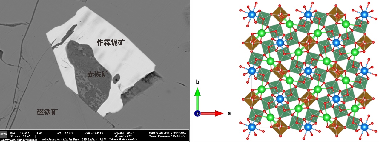 Figure: Microscopic images and crystal structure of Magnesiohongruiite-(Fe³⁺).