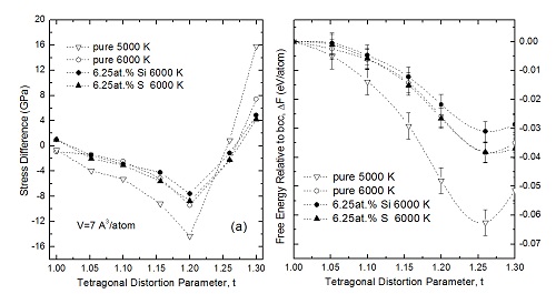 Figure 1. (a) Stress differences of bct lattice with respect to tetragonal strain under different conditions (128 atoms in the system). (b) Integrated free energies relative to bcc structure under different conditions. (Image by CUI)