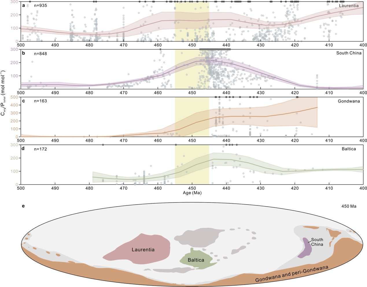 Figure 2 | Evolution of Corg/Ptotal ratios in marine siliciclastic sediments across different paleoplates. (Image courtesy of Prof. ZHAO Mingyu’s group)